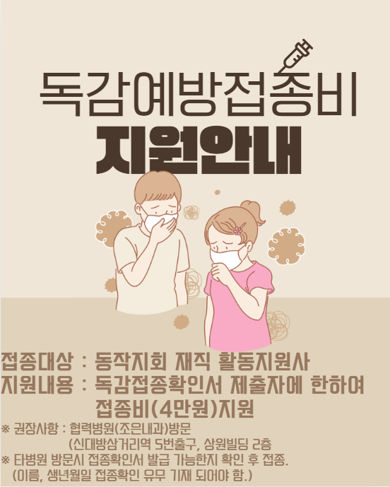 - 지원내용: 독감접종확인서 제출자에 한하여 접종비(4만원) 지원